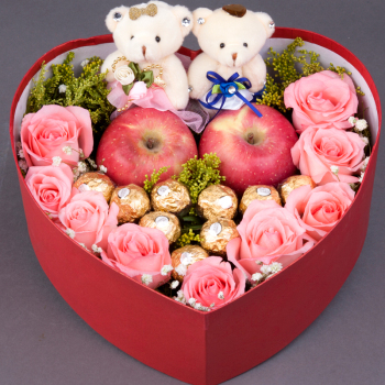 • 8寸心形水果鮮奶蛋糕,3朵奶油玫瑰花及時令水果。
